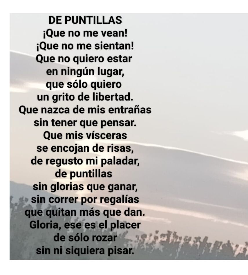 Este poema nació en uno de esos momentos en que necesito elevarme apenas sobre mis pies para ver la vida desde mi pequeñez, sin invadirla. Es un susurro de libertad íntima, un deseo de no dejar huellas que pesen, de sentir sin ruido, de ser sin tener que estar. La imagen que lo acompaña hace visible ese andar callado que a veces me sostiene, cuando sólo quiero rozar el mundo sin marcarlo.